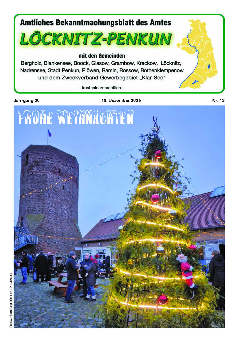 Bekanntmachung in eigener Sache Vom 29.12.2025 bis zum 02.01.2026 wird das Amt Löcknitz-Penkun geschlossen sein. Stefan Müller, Amtsvorsteher |