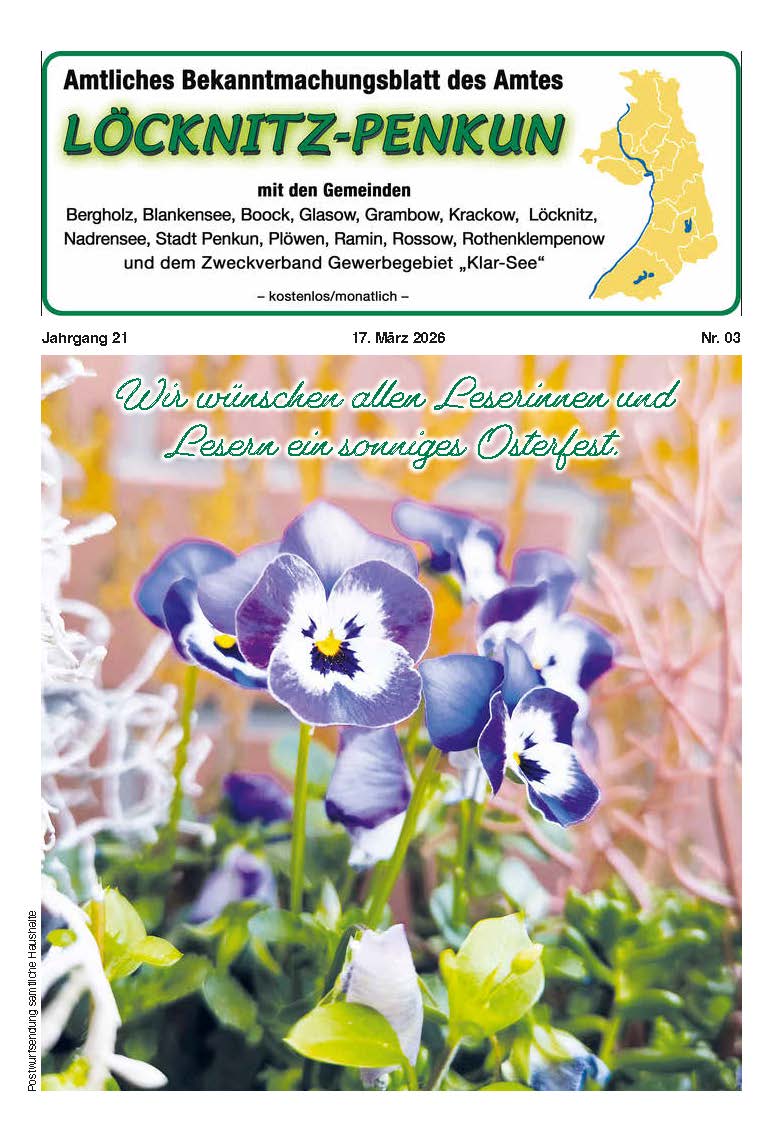 im Namen des Amtsausschusses und der Verwaltung des Amtes Löcknitz-Penkun begrüße ich Sie herzlich auf den Web-Seiten des Amtes und der amtsangehörigen Gemeinden Löcknitz, Plöwen, Bergholz, Blankensee, Boock, Grambow, Ramin, Rossow, Rothenklempenow, Glasow, Krackow, Nadrensee, der Stadt Penkun und des Zweckverbandes Gewerbegebiet (Klar-See).