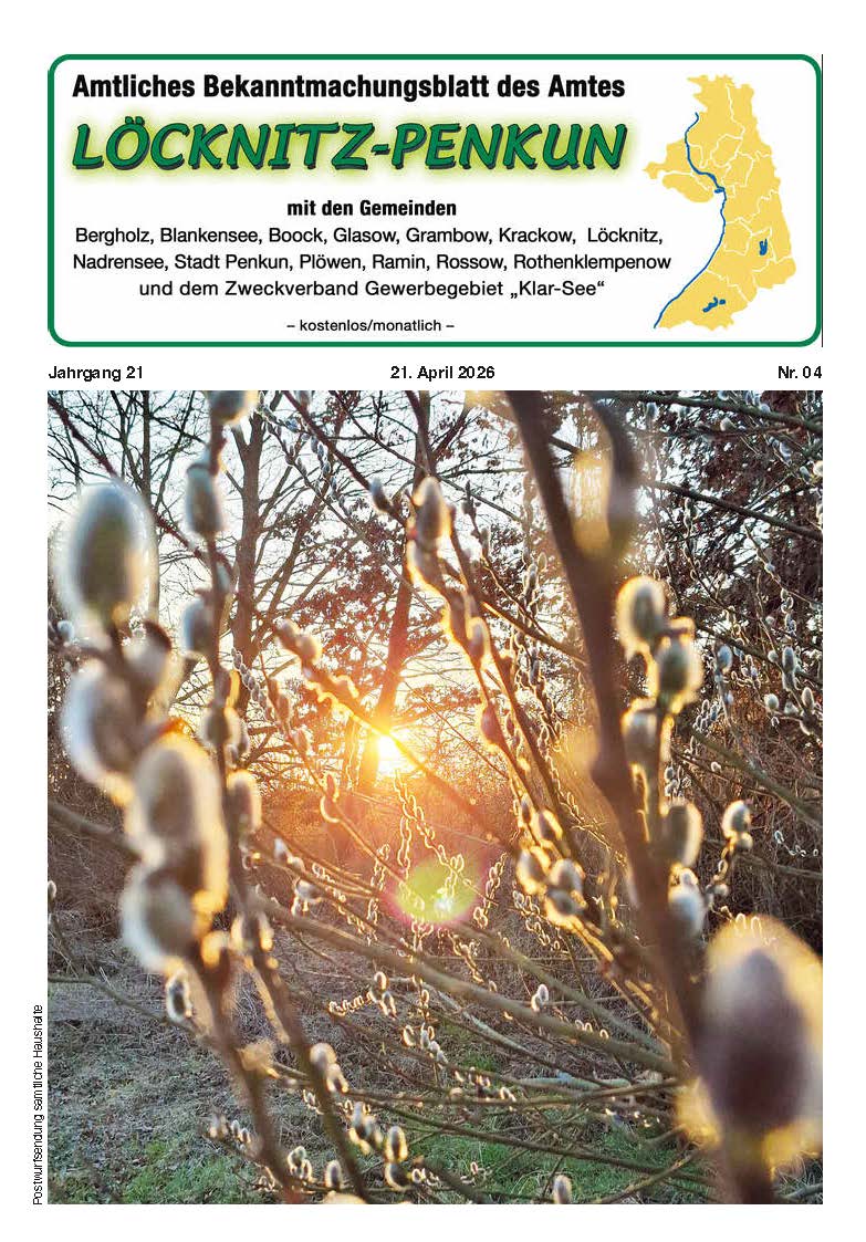 im Namen des Amtsausschusses und der Verwaltung des Amtes Löcknitz-Penkun begrüße ich Sie herzlich auf den Web-Seiten des Amtes und der amtsangehörigen Gemeinden Löcknitz, Plöwen, Bergholz, Blankensee, Boock, Grambow, Ramin, Rossow, Rothenklempenow, Glasow, Krackow, Nadrensee, der Stadt Penkun und des Zweckverbandes Gewerbegebiet (Klar-See).
