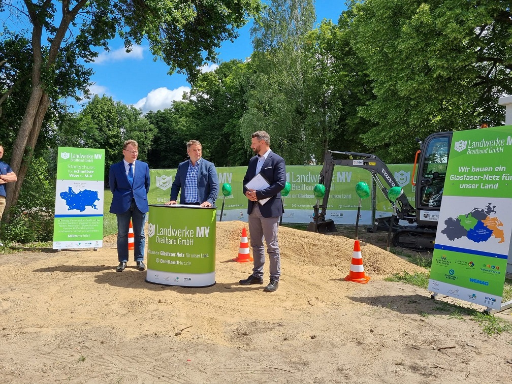 Mit einem symbolischen Spatenstich haben die Landwerke M-V Breitband GmbH in Löcknitz den Bau zum geförderten Breitbandausbau gestartet. Vincent Kokert, einer der Geschäftsführer der Stadtwerke Neustrelitz und vertretend für die Geschäftsführung der Landwerke M-V Breitband GmbH eröffnete den symbolischen Spatenstich mit der Begrüßung der anwesenden Gäste und lobte die gute polnische Zusammenarbeit. Auch Michael Sack, Landrat vom LK Vorpommern-Greifswald und Detlef Ebert, Bürgermeister der Gemeinde Löcknitz hielten eine kleine Ansprache und signalisierten ihre Freude zum Glasfaserausbau im Amtsbereich Löcknitz-Penkun.