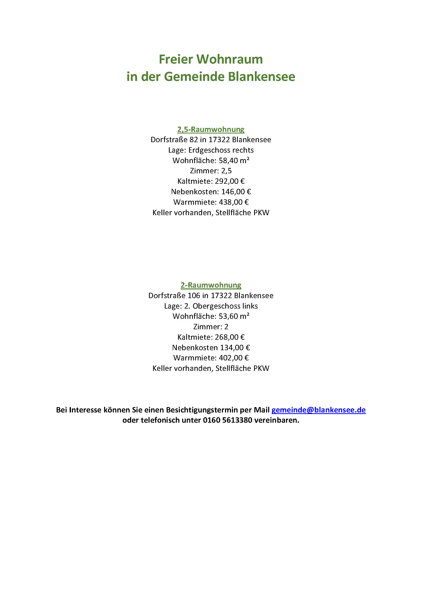 Freier Wohnraum in der Gemeinde Blankensee